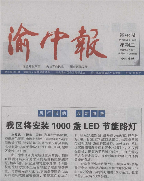 For the implementation of energy saving, promote green lighting, city lighting Bureau recently launched energy-saving renovation project back lane, plans in Yuzhong and Jiulongpo part Beijiexiaoxiang installed energy-saving LED Street 1905, among them, Yuzhong District installed 1000 lights.