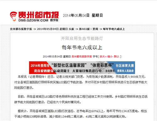 Kaiyang County County of Guizhou Province, our warm congratulations on the implementation of the transformation of the LED Street project in Guizhou province was the mainstream media "Guizhou Metropolis Daily" sure. The county of Kaiyang County in Guizhou province in May 4, 2014 "Guizhou Metropolis Daily" on the implementation of the transformation of our LED streetlight project were reported, now reprinted as follows: